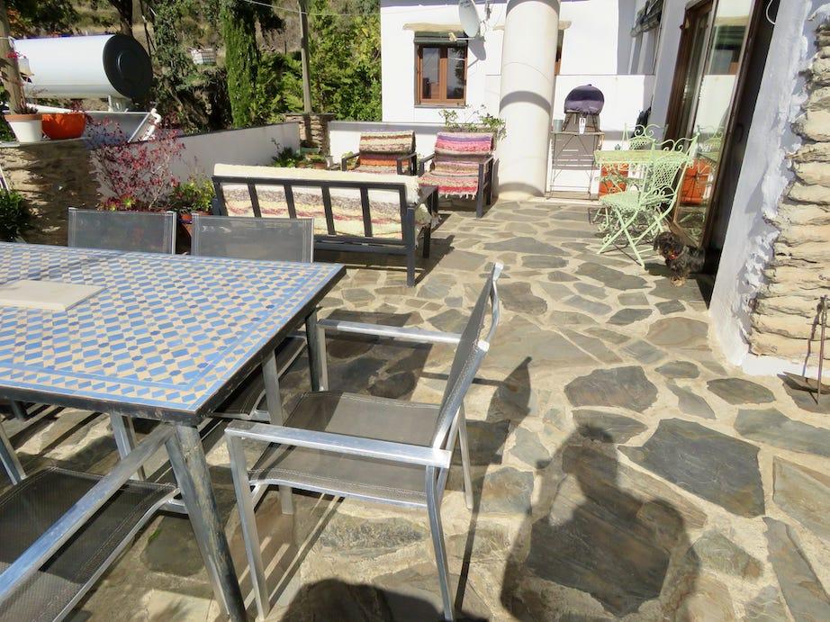 The main house. On the upper floor is the owners apartment which consists of a spacious through lounge with wide patio doors on two sides offering access to a private terrace and spectacular views across the Rio Trevélez valley to the mountains beyond; a modern fully fitted kitchen with breakfast bar; master bedroom; bathroom; and stairs down to a second bedroom which currently doubles as an office.