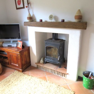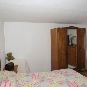 To the left is a cosy living room with a traditional wood burner, a great place to relax on chilly winter nights. There are superb views of the surrounding mountains through the window at the rear of the room. Because of the thickness of the walls, this is also a cool room in the hot summer months. A door leads through to a small hall with a bedroom and the bathroom off. The spacious double bedroom has freestanding furniture and a built-in wardrobe. The bathroom features a slate topped vanity unit with a traditional ceramic washbasin and a bathtub with shower over.